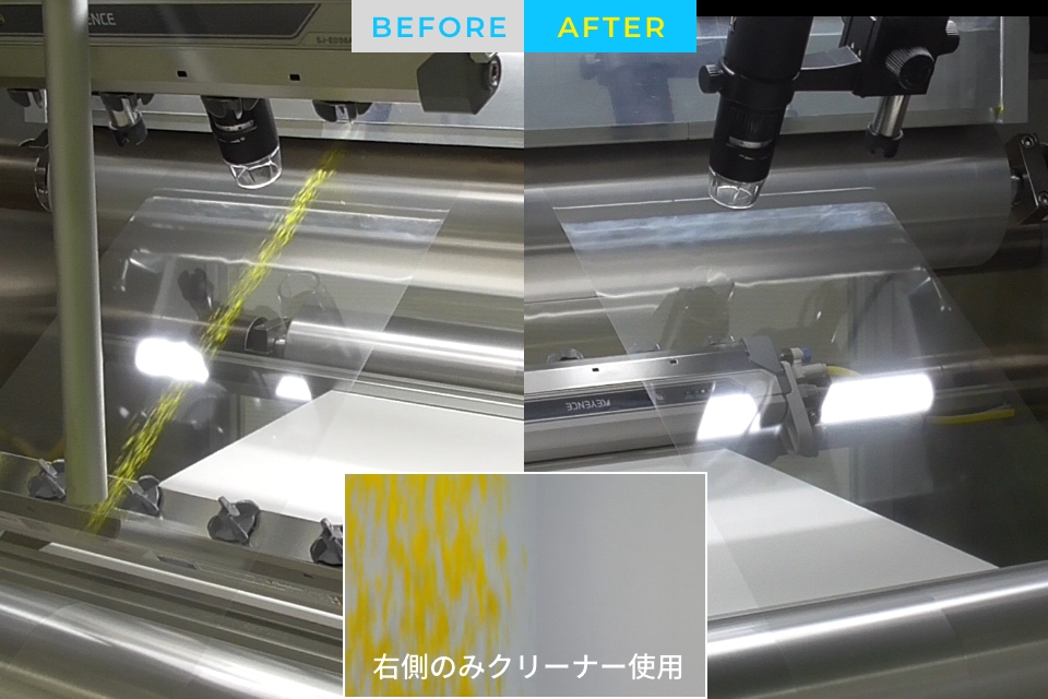 運転中清掃により、ライン停止の必要がなくなるため、生産性が向上し、不良品の発生を未然に防ぐことができます。特に長尺フィルムや高速ラインでの導入効果は大きく、安定した工程運転が可能になります。